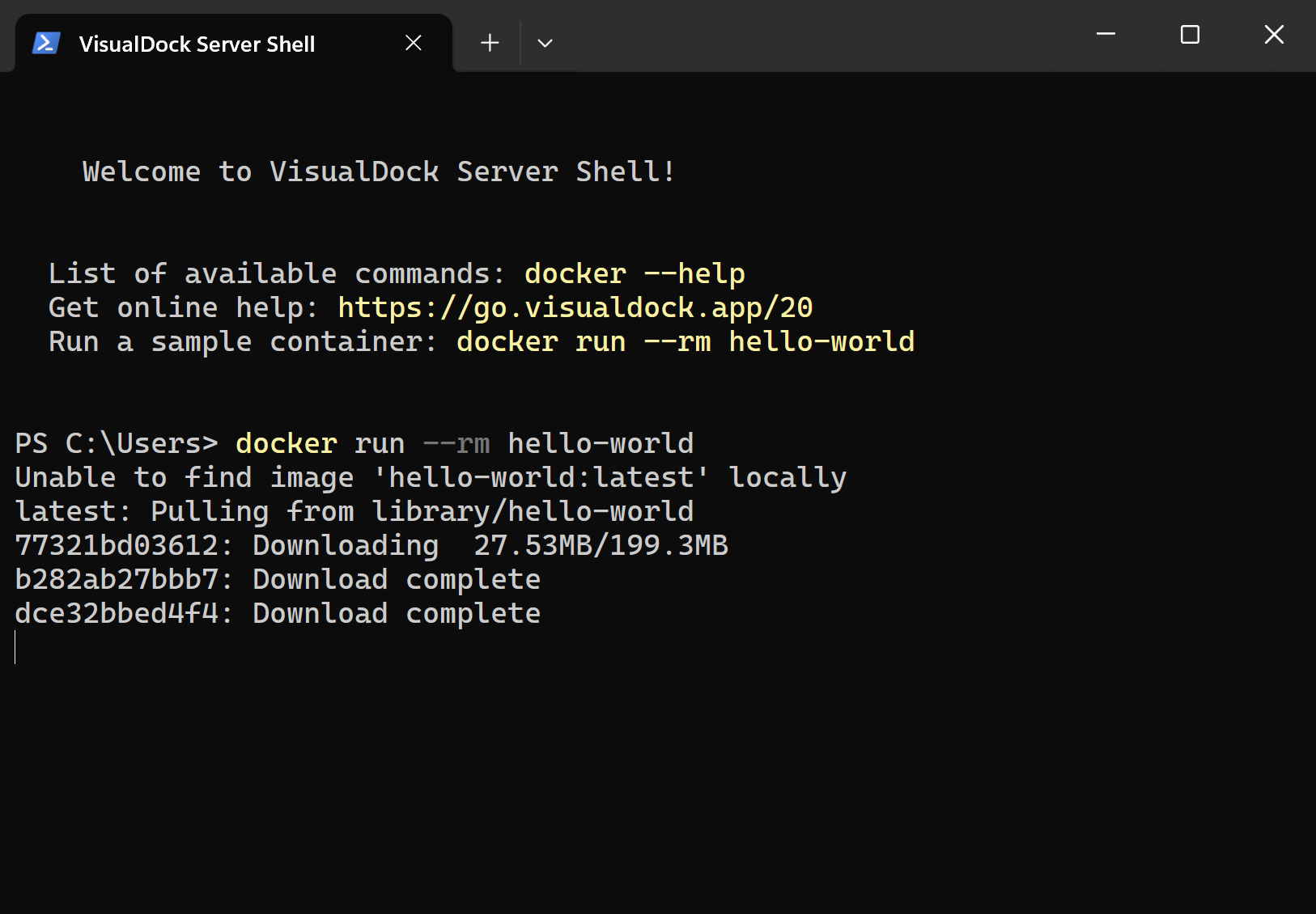 docker.exe). - VisualDock Server Manager has a dedicated shell to execute the commands.