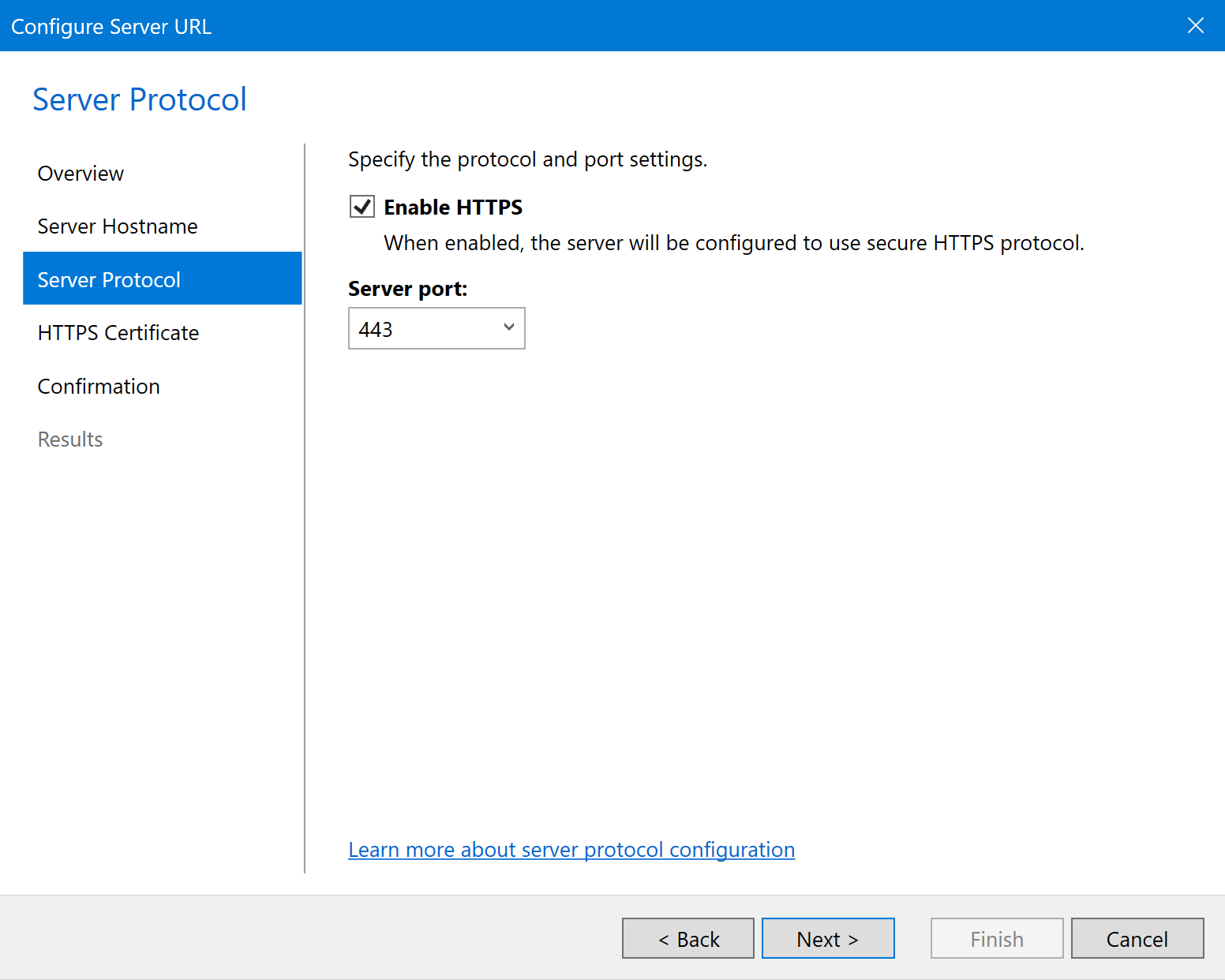 If your environment has Active Directory Certificate Services (AD CS), you can obtain an SSL certificate right from within the Server URL wizard: